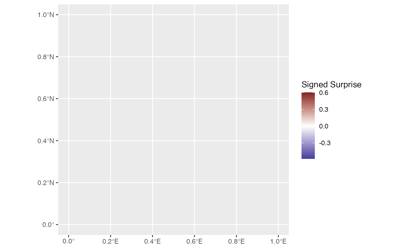 Diverging color scale for signed surprise values. Negative values (lower than expected) are shown in one color, positive values (higher than expected) in another, with neutral (zero) in the middle.